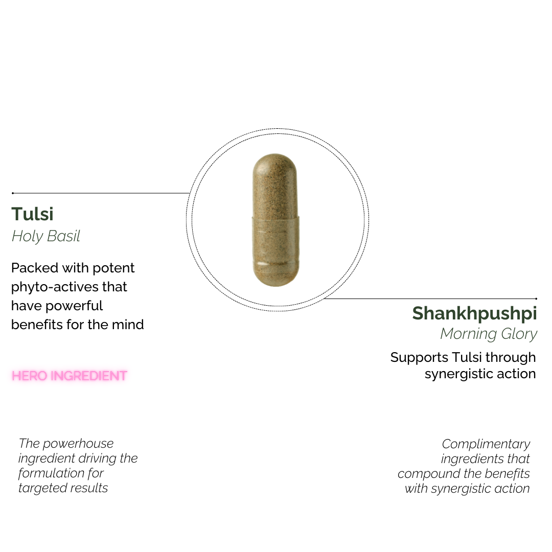 Herbal ingredients: Brahmi (Bacopa monnieri), Tagar (Valeriana wallichii), Jatamansi (Nardostachys jatamansi), Ashwagandha (Withania somnifera), Mandukparni (Centella asiatica), and Vacha (Acorus calamus).